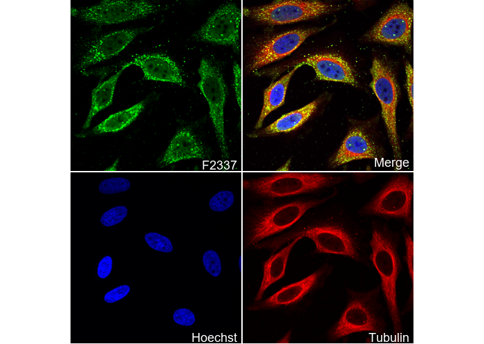 • Immunofluorescent analysis of Hela cells using F2337 (green, 1:100), Hoechst (blue) and tubulin (Red).