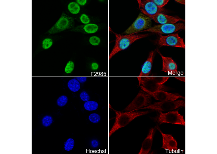 • Immunofluorescent analysis of NIH/3T3 cells using F2985 (green, 1:100), Hoechst (blue) and tubulin (Red).