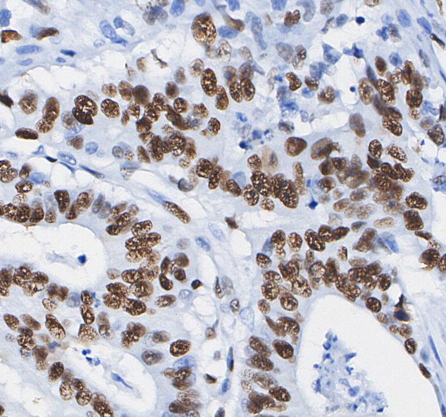 • Immunohistochemical analysis of formalin fixed paraffin embedded human Colorectal cancer tissue with F0408 at 1/100 dilution.