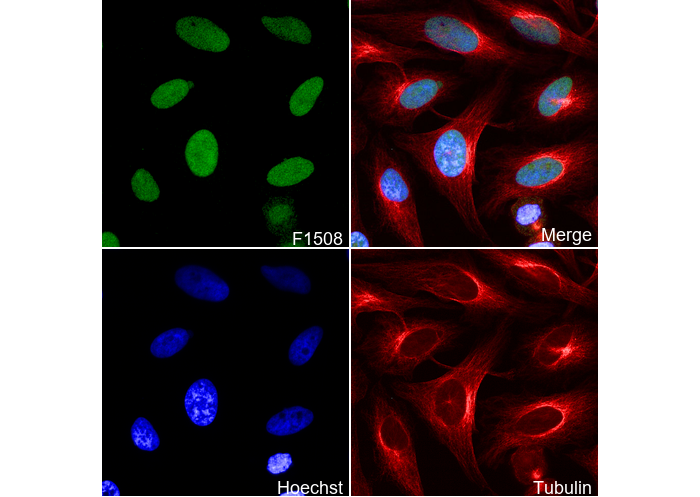 • Immunofluorescent analysis of Hela cells using F1508 (green, 1:100), Hoechst (blue) and tubulin (Red).