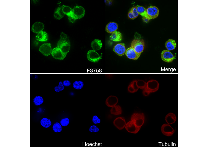 • Immunofluorescent analysis of Neuro-2a cells using F3758 (green, 1:50), Hoechst (blue) and tubulin (Red).