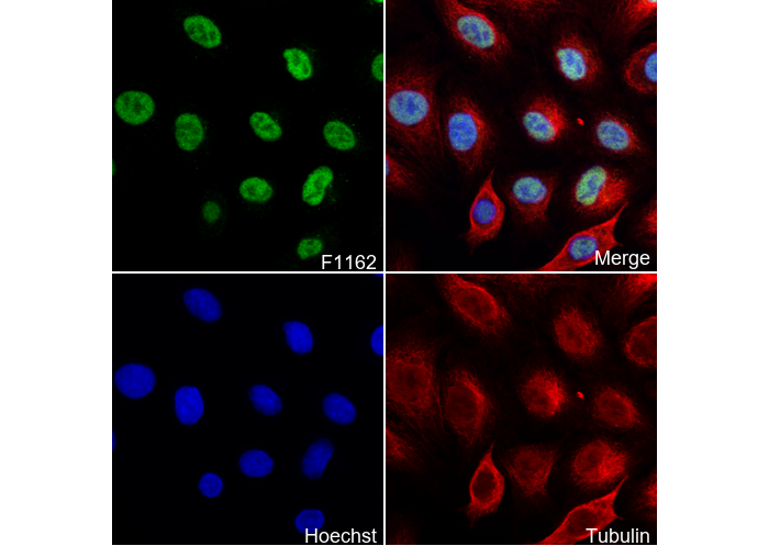 • Immunofluorescent analysis of A549 cells using F1162 (green, 1:100 ), Hoechst (blue) and tubulin (Red).