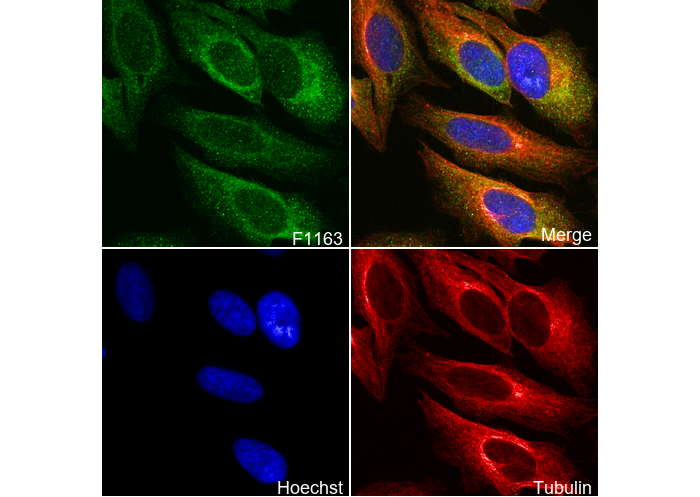 • Immunofluorescent analysis of Hela cells using F1163 (green, 1:100), Hoechst (blue) and tubulin (Red).