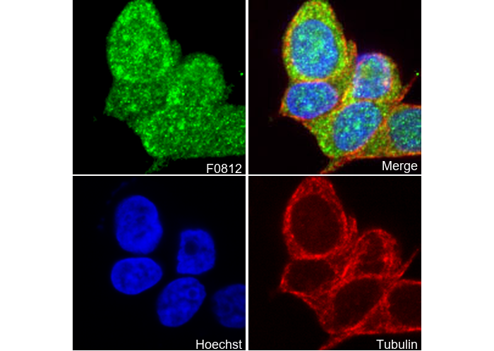 • Immunofluorescent analysis of MCF-7 cells using F0812 (green, 1:200), Hoechst (blue) and tubulin (Red).