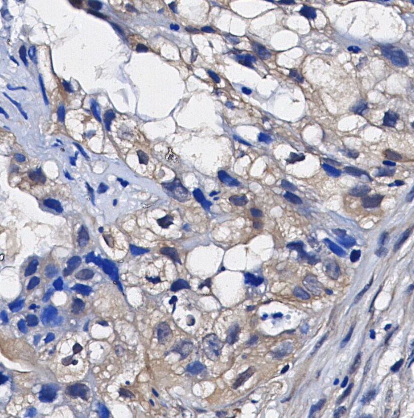 • Immunohistochemical analysis of formalin fixed paraffin embedded human Lung adenocarcinoma tissue with F1014 at 1/100 dilution.