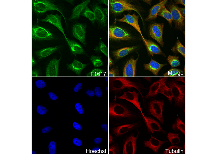 • Immunofluorescent analysis of Hela cells using F1617 (green, 1:100), Hoechst (blue) and tubulin (Red).