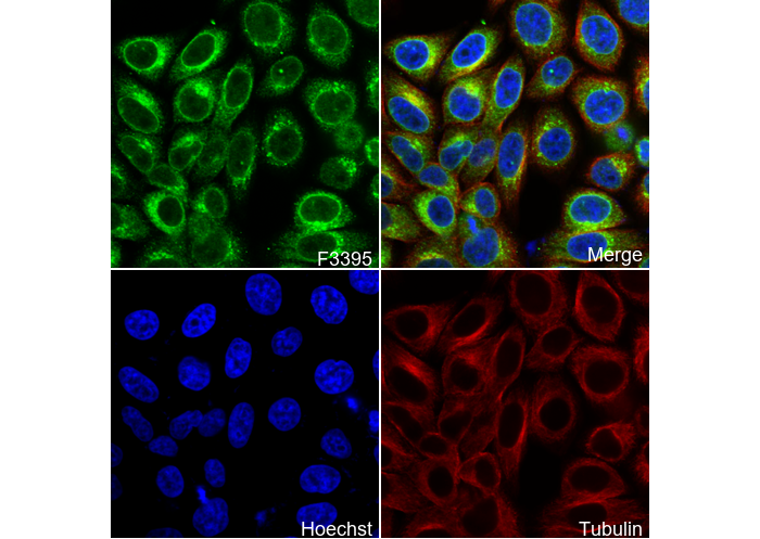 • Immunofluorescent analysis of HepG2 cells using F3395 (green, 1:100), Hoechst (blue) and tubulin (Red).