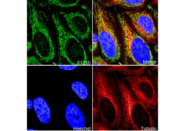 • Immunofluorescent analysis of Hela cells using F1210 (green, 1:200), Hoechst (blue) and tubulin (Red).