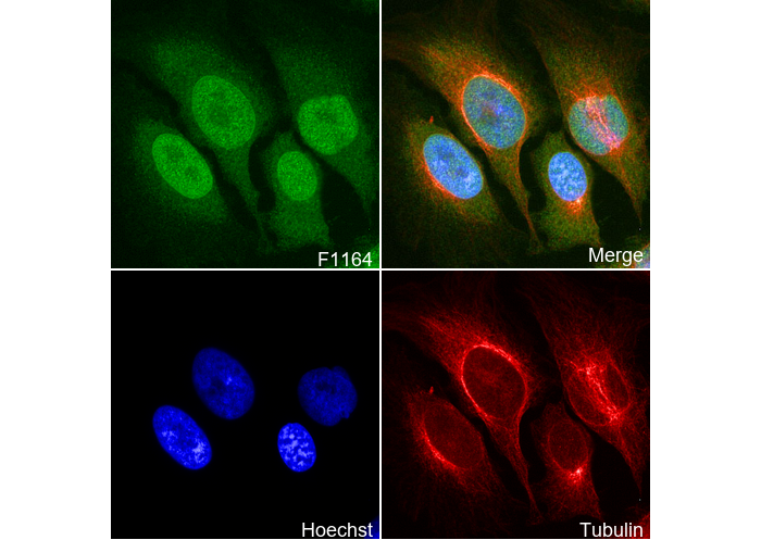 • Immunofluorescent analysis of Hela cells using F1164 (green, 1:100), Hoechst (blue) and tubulin (Red).