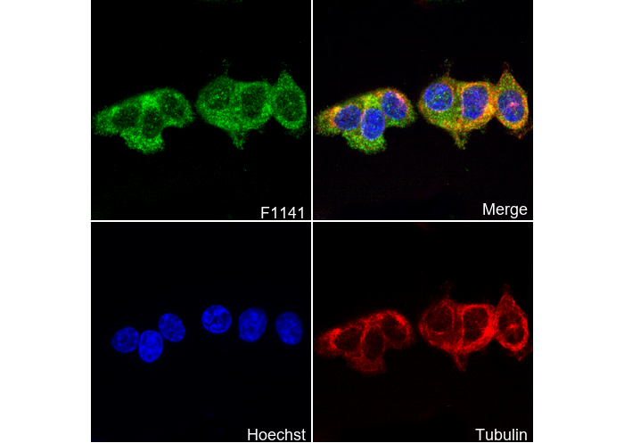 • Immunofluorescent analysis of HCT116 cells using F1141 (green, 1:100), Hoechst (blue) and tubulin (Red).