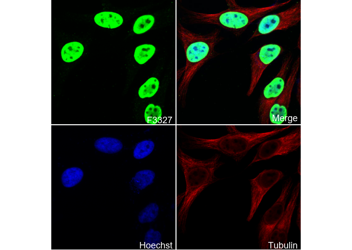 • Immunofluorescent analysis of Hela cells using F3327 (green, 1:1000), Hoechst (blue) and tubulin (Red).