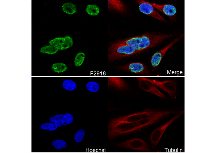 • Immunofluorescent analysis of Hela cells using F2918 (green, 1:100), Hoechst (blue) and tubulin (Red).