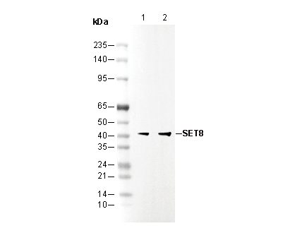 SET8 Antibody [N21K13] detects endogenous levels of total SET8 protein (both isoforms). The antibody also crossreacts with an unidentified protein at 50kDa.