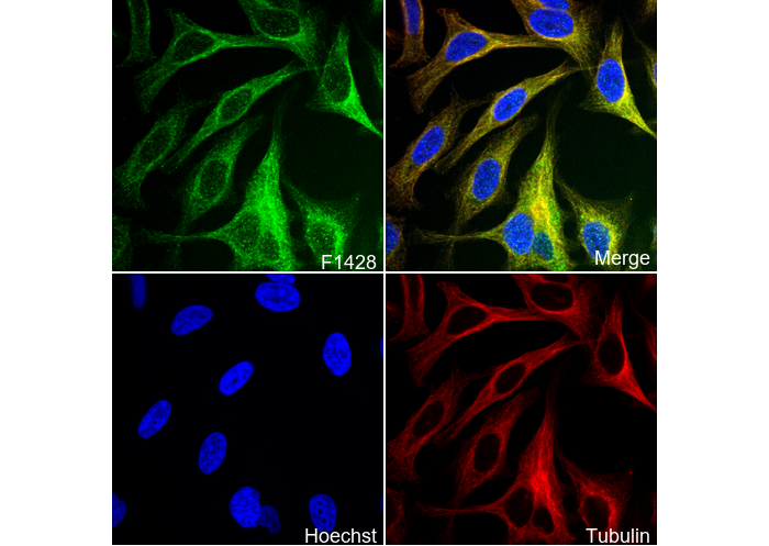 • Immunofluorescent analysis of Hela cells using F1428 (green, 1:400), Hoechst (blue) and tubulin (Red).