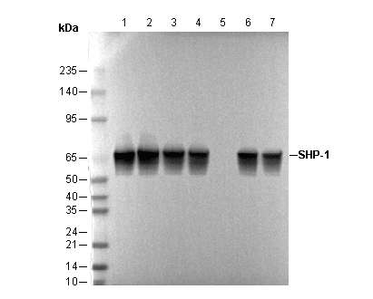 SHP-1, also known as PTPN6, is a non-receptor protein tyrosine phosphatase primarily found in hematopoietic cells. Its structure includes two SH2 domains, a catalytic tyrosine phosphatase domain, and a regulatory domain at the carboxy-terminal end. SHP-1 functions by dephosphorylating target proteins, thereby downregulating several pathways regulated by tyrosine kinases. In hematopoietic cells, the SH2 domain located at the amino-terminal region of SHP-1 binds to tyrosine-phosphorylated erythropoietin receptors (EPORs), leading to the negative regulation of hematopoietic growth. When overexpressed in epithelial cells, SHP-1 induces the dephosphorylation of the Ros receptor tyrosine kinase, subsequently reducing Ros-dependent cell proliferation and transformation.