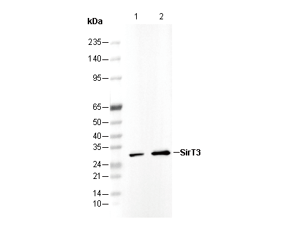 The Silent Information Regulator (SIR2) gene family encompasses a highly conserved set of genes encoding nicotinamide adenine dinucleotide (NAD)-dependent protein deacetylases, also known as Class III histone deacetylases. Among these genes, Saccharomyces cerevisiae Sir2 stands as the first-discovered and most extensively studied, playing roles in the silencing of mating type loci, telomere maintenance, DNA damage response, and cellular aging. In mammalian cells, SirT3 serves as a homolog of Sir2, existing in two forms. The full-length 44 kDa protein localizes within the nucleus, while a processed 28 kDa protein lacking the first 142 amino terminal residues is exclusive to the mitochondria. The murine equivalent of SirT3 corresponds to the processed form found in humans. The full-length SirT3 protein undergoes processing within the mitochondrial matrix facilitated by the mitochondrial matrix processing peptidase (MMP). Both full-length and processed forms of SirT3 exhibit enzymatic activity, deacetylating histone H3 at Lys9 and histone H4 at Lys16 in vitro. Additionally, SirT3 deacetylates Lys642 of acetyl-CoA synthetase 2 (AceCS2) and enhances its activity within the mitochondria. Elevated expression of SirT3 leads to increased levels of mitochondrial uncoupling protein 1 (UCP1).