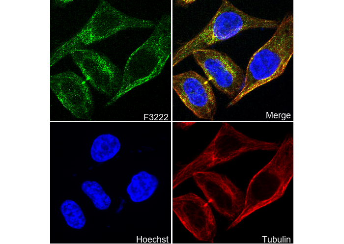 • Immunofluorescent analysis of HepG2 cells using F3222 (green, 1:100), Hoechst (blue) and tubulin (Red).