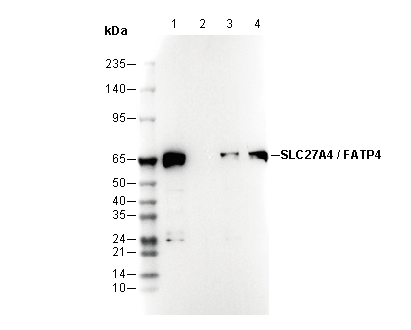 • Lane 1: HAP1 , Lane 2: HAP1 (KO SLC27A4/FATP4) , Lane 3: HEK293 , Lane 4: HepG2