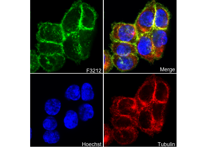 • Immunofluorescent analysis of HT-29 cells using F3212 (green, 1:100), Hoechst (blue) and tubulin (Red).