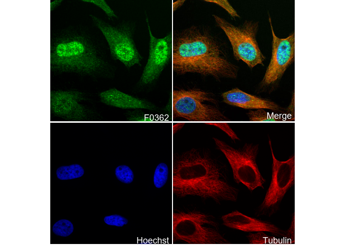 • Immunofluorescent analysis of A549 cells using F0362 (green, 1:200), Hoechst (blue) and tubulin (Red).