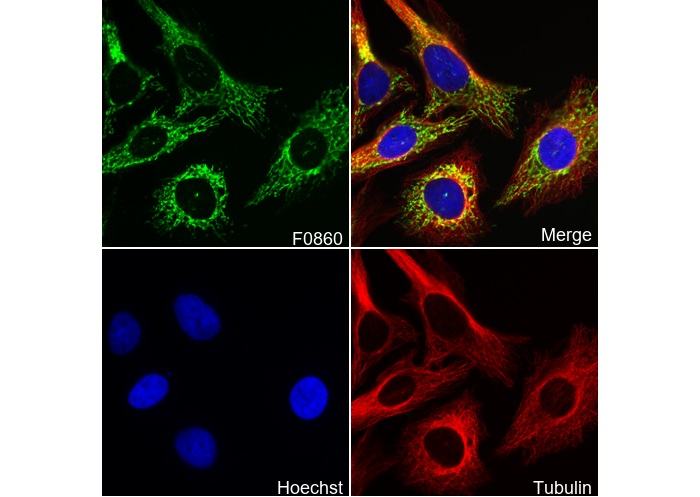 • Immunofluorescent analysis of Hela cells using F0860 (green, 1:100), Hoechst (blue) and tubulin (Red).