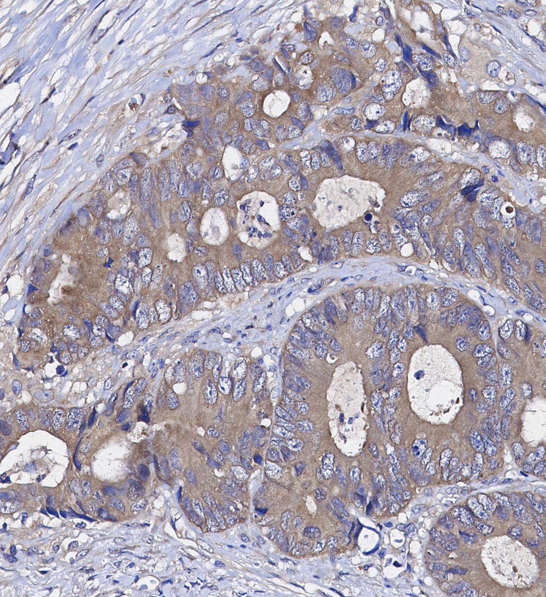 • Immunohistochemical analysis of formalin fixed paraffin embedded human Colorectal cancer tissue with F0860 at 1/100 dilution.