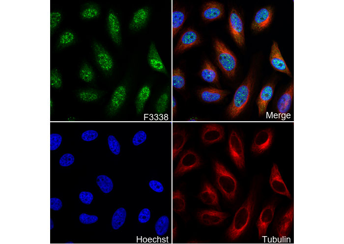 • Immunofluorescent analysis of Hela cells using F3338 (green, 1:100), Hoechst (blue) and tubulin (Red).
