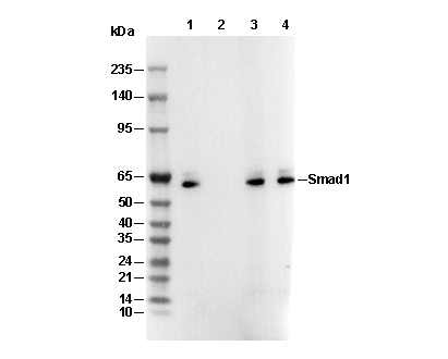 • Lane 1: HeLa, Lane 2: HeLa (KO SMAD1), Lane 3: NIH/3T3, Lane 4: C2C12