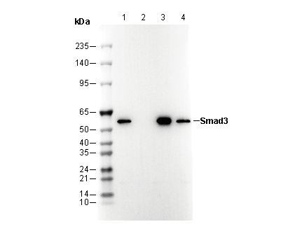 • Lane 1: A549, Lane 2: A549 (KO SMAD3), Lane 3: HeLa, Lane 4: Rat liver