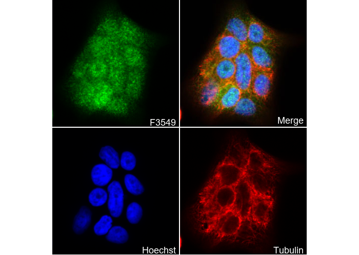 • Immunofluorescent analysis of HACAT cells using F3549 (green, 1:400), Hoechst (blue) and tubulin (Red).