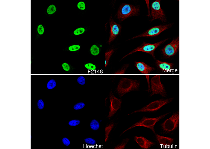 • Immunofluorescent analysis of Hela cells using F2148 (green, 1:50), Hoechst (blue) and tubulin (Red).