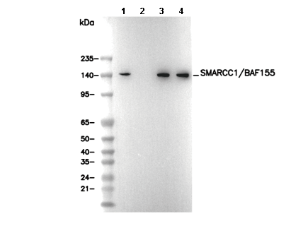 • Lane 1: HeLa, Lane 2: HeLa (KO SMARCC1), Lane 3: Jurkat, Lane 4: Rat testis
