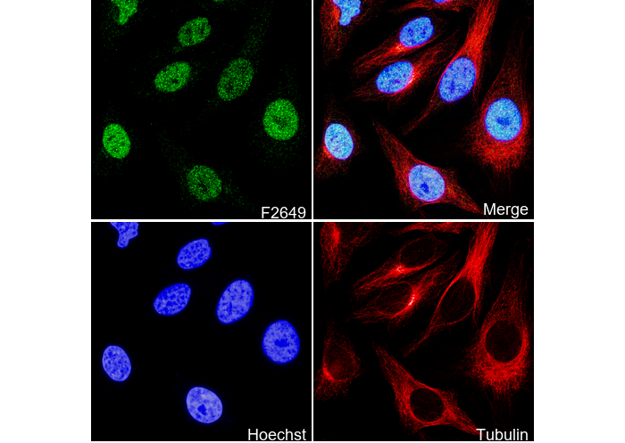 • Immunofluorescent analysis of Hela cells using F2649 (green, 1:100), Hoechst (blue) and tubulin (Red).