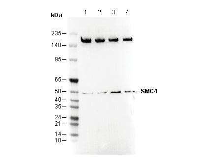 SMC4 Antibody [N23N17] detects endogenous levels of total SMC4 protein. Based on sequence homology, the antibody does not cross-react with other SMC proteins, including SMC1, SMC2 and SMC3. A band of unknown origin is detected at around 48 kDa.