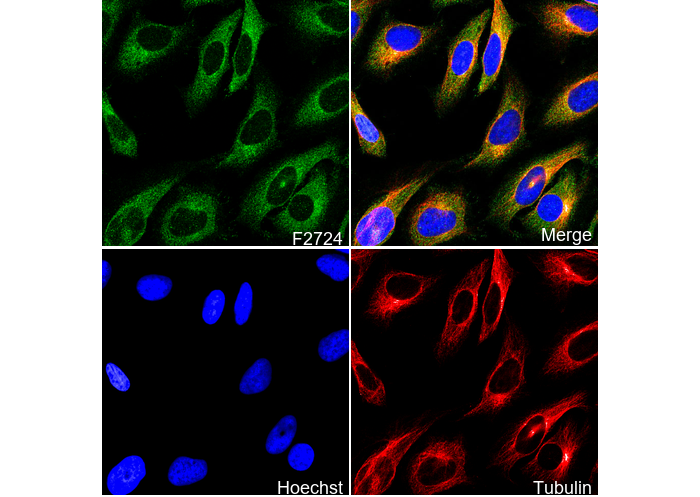 • Immunofluorescent analysis of Hela cells using F2724 (green, 1:100), Hoechst (blue) and tubulin (Red).