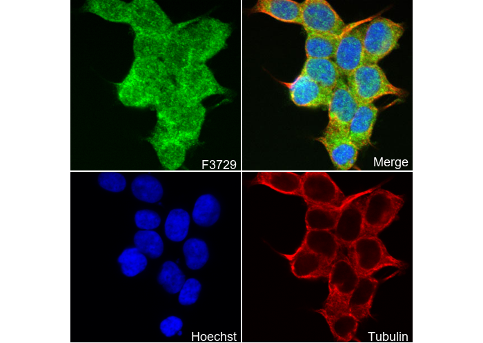 • Immunofluorescent analysis of 293T cells using F3729 (green, 1:50), Hoechst (blue) and tubulin (Red).