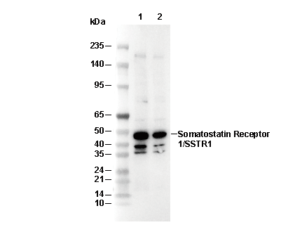Somatostatin Receptor 1/SSTR1 Antibody [F9M21] detects endogenous levels of total Somatostatin Receptor 1/SSTR1 protein.