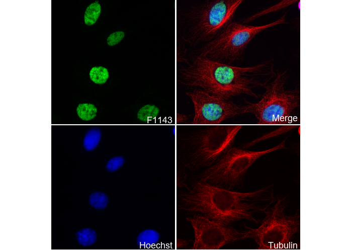 • Immunofluorescent analysis of C6 cells using F1143 (green, 1:500), Hoechst (blue) and tubulin (Red).
