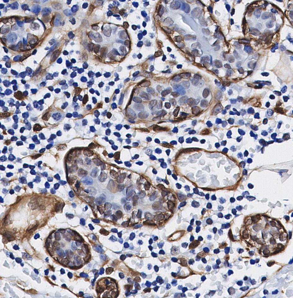 • Immunohistochemical analysis of formalin fixed paraffin embedded human Breast Cancer tissue with F1143 at 1/100 dilution.