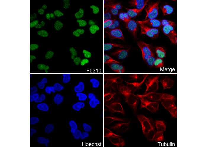 • Immunofluorescent analysis of NTERA-2 cells using F0310 (green, 1:400), Hoechst (blue) and tubulin (Red).