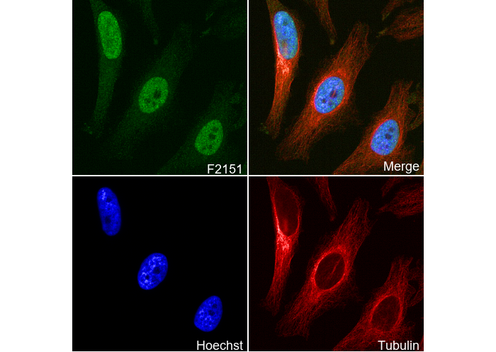 • Immunofluorescent analysis of Hela cells using F2151 (green, 1:100), Hoechst (blue) and tubulin (Red).
