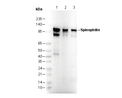 Spinophilin Antibody [A7J8] recognizes endogenous levels of total spinophilin protein.