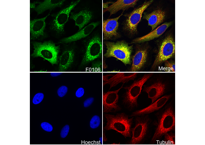 • Immunofluorescent analysis of Hela cells using F0106 (green, 1:400), Hoechst (blue) and tubulin (Red).