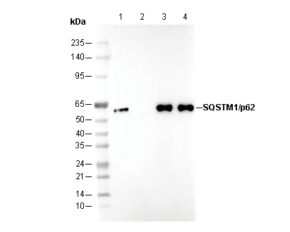 • Lane 1: HAP1 , Lane 2: HAP1 (KO SQSTM1) , Lane 3: HeLa , Lane 4: HepG2