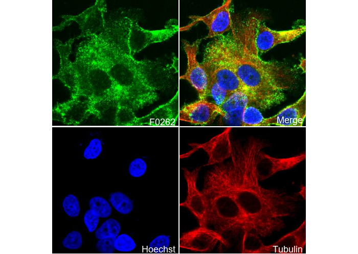 • Immunofluorescent analysis of MCF-7 cells using F0262 (green, 1:400), Hoechst (blue) and tubulin (Red).