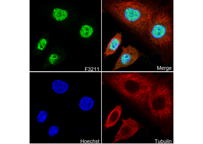 • Immunofluorescent analysis of PC-12 cells using F3211 (green, 1:500), Hoechst (blue) and tubulin (Red).