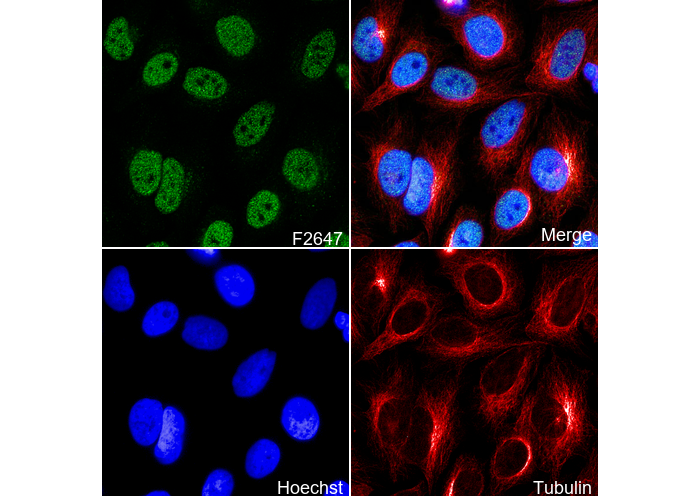 • Immunofluorescent analysis of Hela cells using F2647 (green, 1:100), Hoechst (blue) and tubulin (Red).