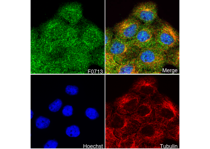 • Immunofluorescent analysis of A431 cells using F0713 (green, 1:100), Hoechst (blue) and tubulin (Red).