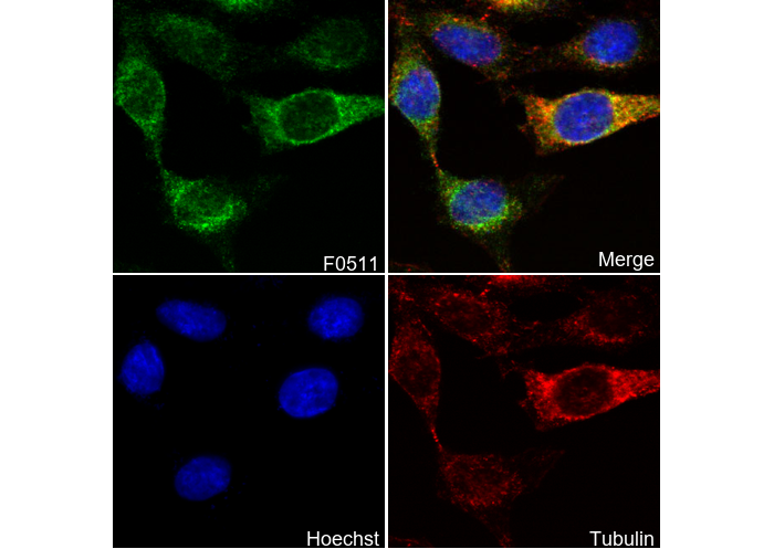 • Immunofluorescent analysis of Hela cells using F0511 (green, 1:200), Hoechst (blue) and tubulin (Red).