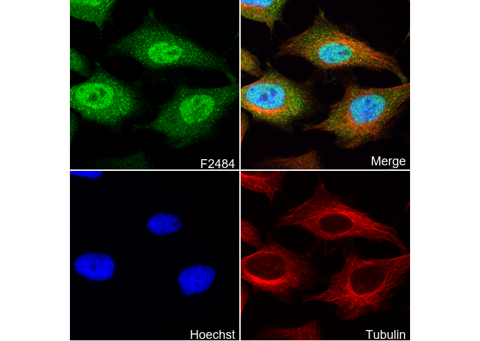 • Immunofluorescent analysis of Hela cells using F2484 (green, 1:100), Hoechst (blue) and tubulin (Red).